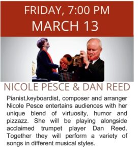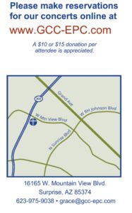 Dan and Nicole Pesce @ Grace Community ChurchBy bobsallaz / 01/27/2026 Dan and Nicole Pesce @ Grace Community Church by Dan Reed 20 20 people viewed this event. Dan and Nicole Pesce @ Grace Community Church on March 13, 2026 7 to 8 pm. 16165 W. Mountain View Blvd., Surprise, AZ 85374 Register for event To register for this event please visit the following URL: → Date And Time Friday, March 13, 2026 @ 07:00 PM Location 16165 W. Mountain View Blvd., Surprise, AZ 85374 Event Types Concert or Performance Event Category Performing & Visual Arts Share With Friends Facebook Twitter Linkedin Xing Pinterest